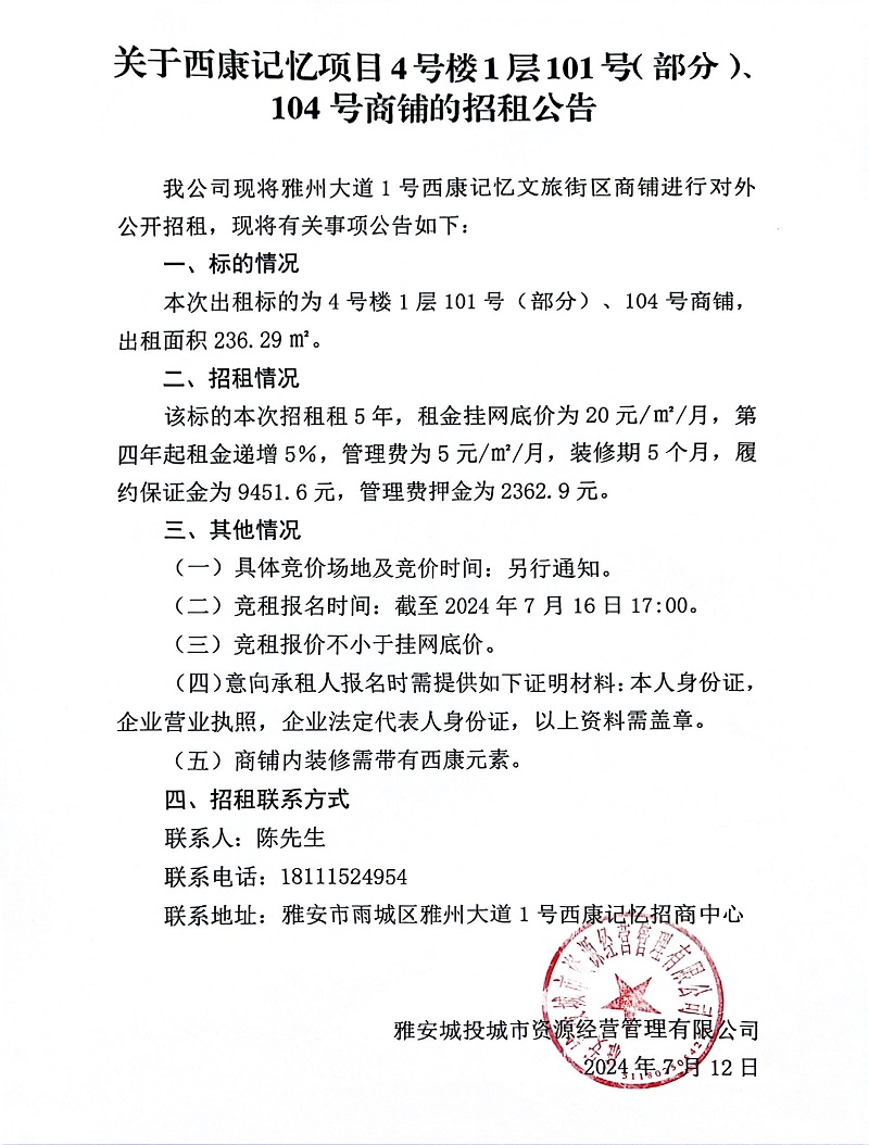 關于西康記憶項目4號樓1層101號(部分)、104號商鋪的招租公告