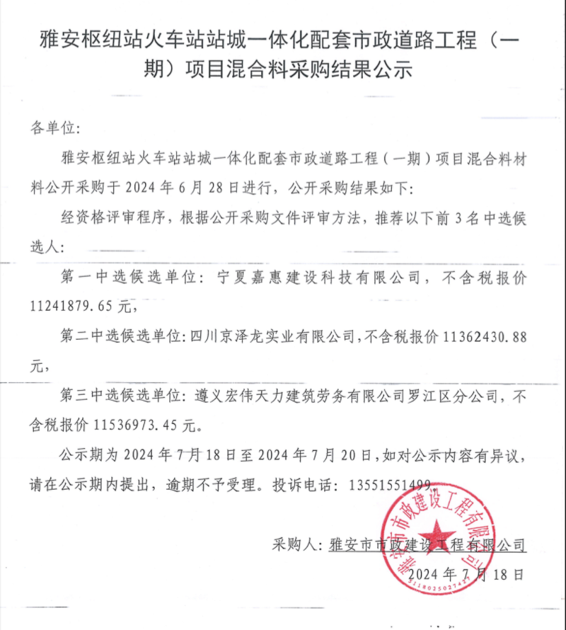 雅安樞紐站火車站站城一體化配套市政道路工程(一期)項(xiàng)目混合料采購(gòu)結(jié)果公示