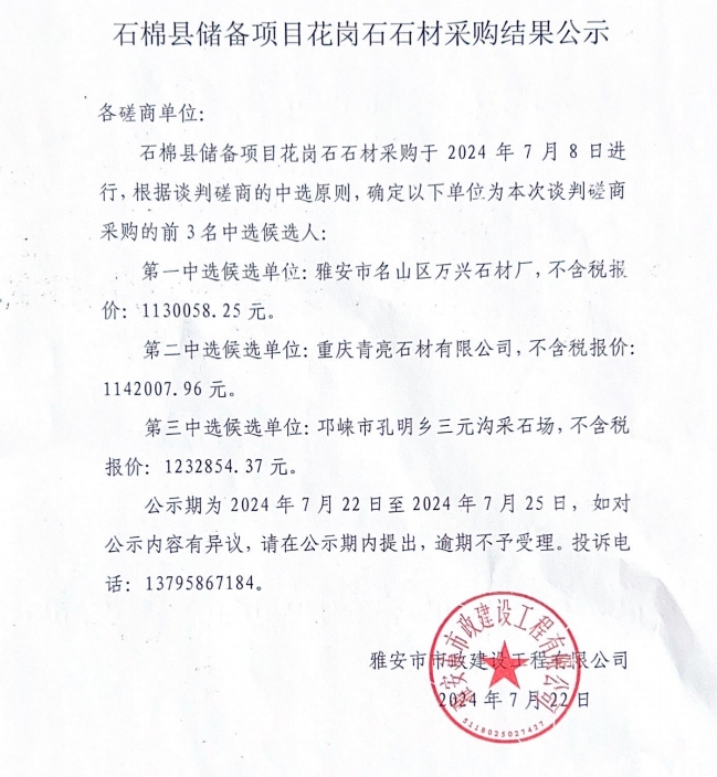 石棉縣儲備項目花崗石石材采購結(jié)果公示