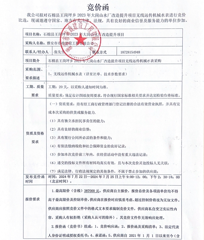 2023年大崗山水廠改造提升項目無線遠(yuǎn)傳機(jī)械水表競價函