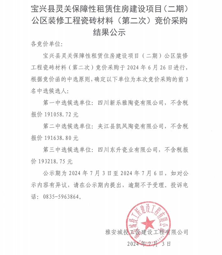 寶興縣靈關(guān)保障性租賃住房建設(shè)項目(二期)公區(qū)裝修工程瓷磚材料(第二次)競價采購結(jié)果公示)