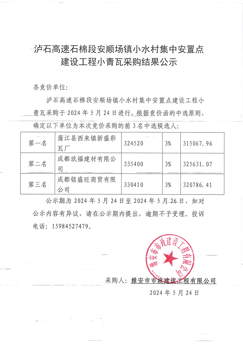 瀘石高速石棉縣段安順場鎮(zhèn)小水村集中安置點(diǎn)建設(shè)工程小青瓦采購結(jié)果公示