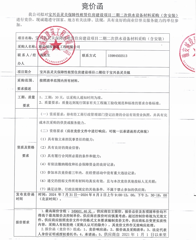 寶興縣靈關(guān)保障性租賃住房建設(shè)項(xiàng)目二期二次供水設(shè)備采購(gòu)(含安裝)競(jìng)價(jià)公告