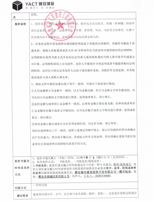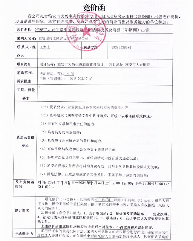 附件2:雅安市大興生態(tài)旅游建設(shè)項目舊活動板房出售競價函