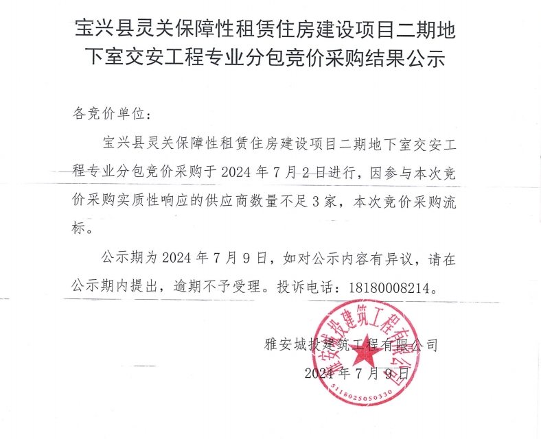 寶興縣靈關(guān)保障性租賃住房建設(shè)項(xiàng)目二期地下室交安工程專業(yè)分包競(jìng)價(jià)采購(gòu)結(jié)果公示