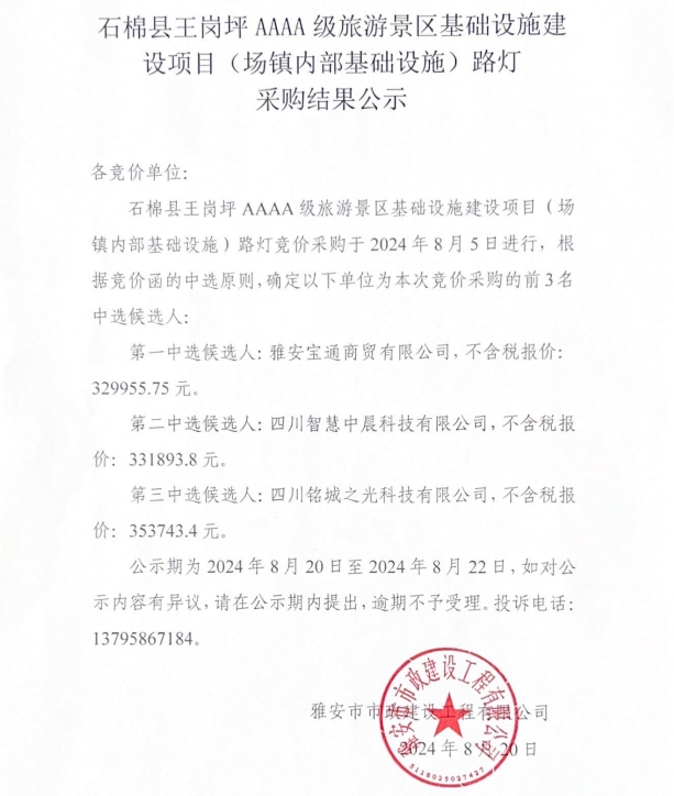 石棉縣王崗坪鄉(xiāng)AAAA級(jí)旅游景區(qū)基礎(chǔ)設(shè)施建設(shè)項(xiàng)目(場鎮(zhèn)內(nèi)部基礎(chǔ)設(shè)施)路燈采購結(jié)果公示
