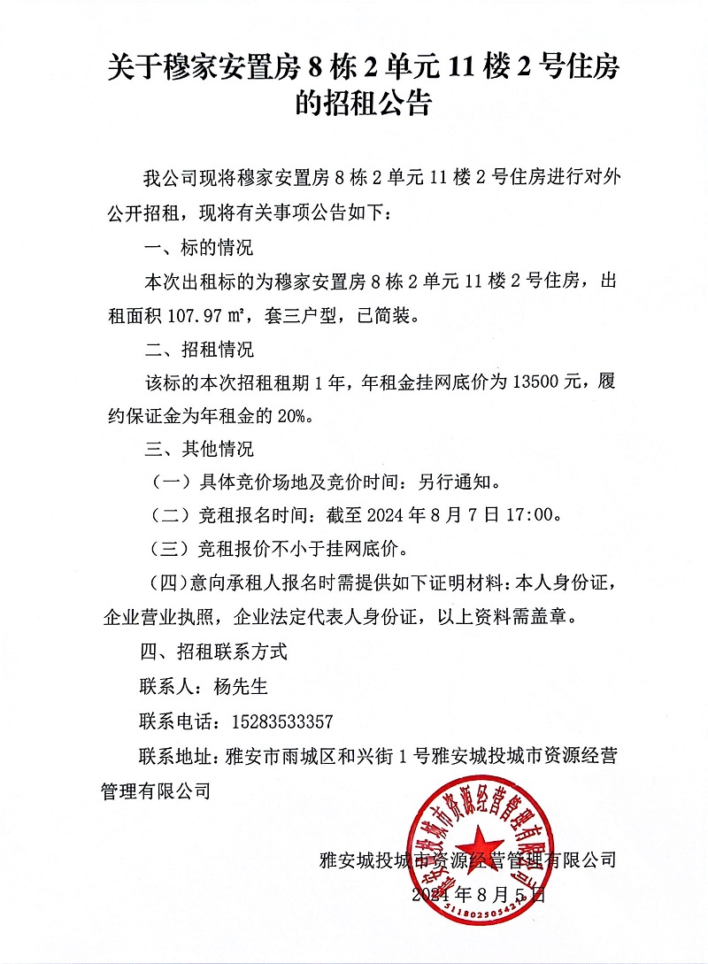 關于穆家安置房8棟2單元11樓2號住房的招租公告