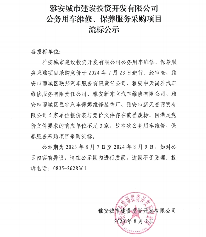 雅安城市建設(shè)投資開發(fā)有限公司公務(wù)用車維修、保養(yǎng)服務(wù)采購(gòu)項(xiàng)目流標(biāo)公示
