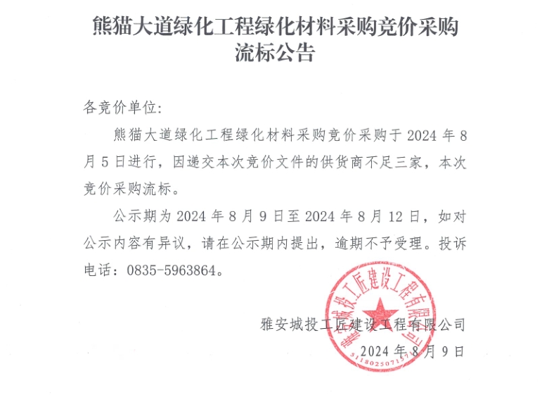 熊貓大道綠化工程綠化材料采購競價采購流標(biāo)公告