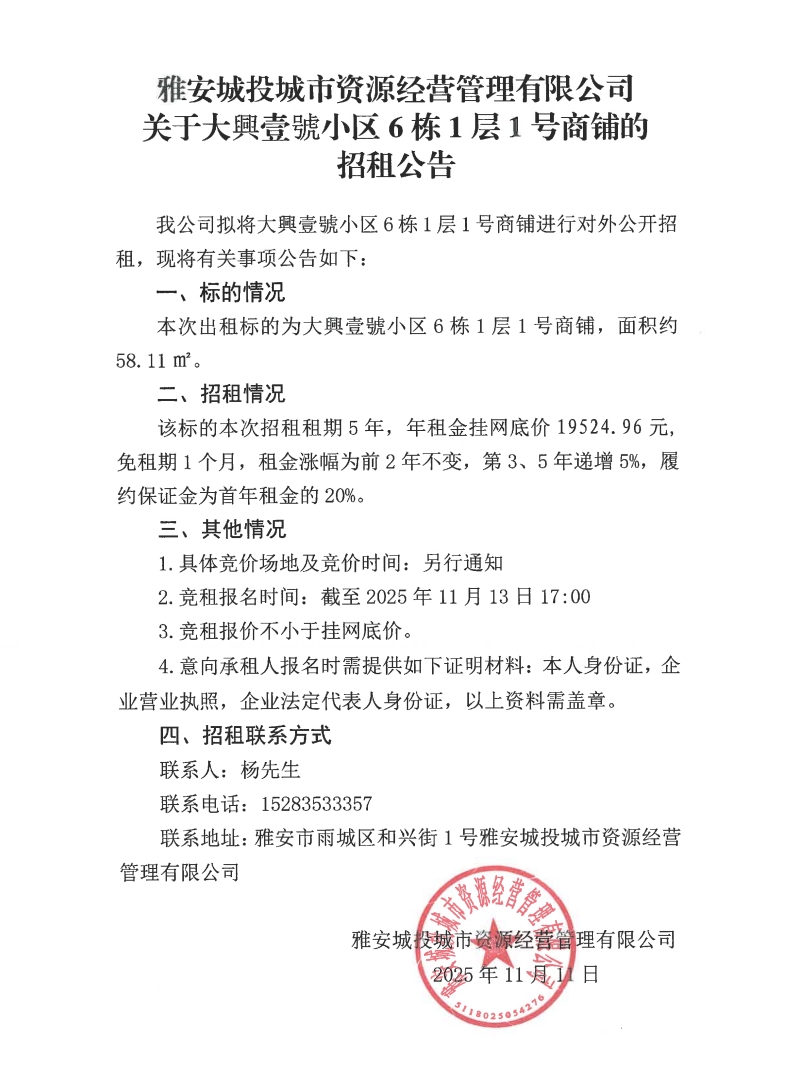 雅安城投城市資源經(jīng)營管理有限公司關于大興壹號小區(qū)6棟1層1號商鋪的招租公告