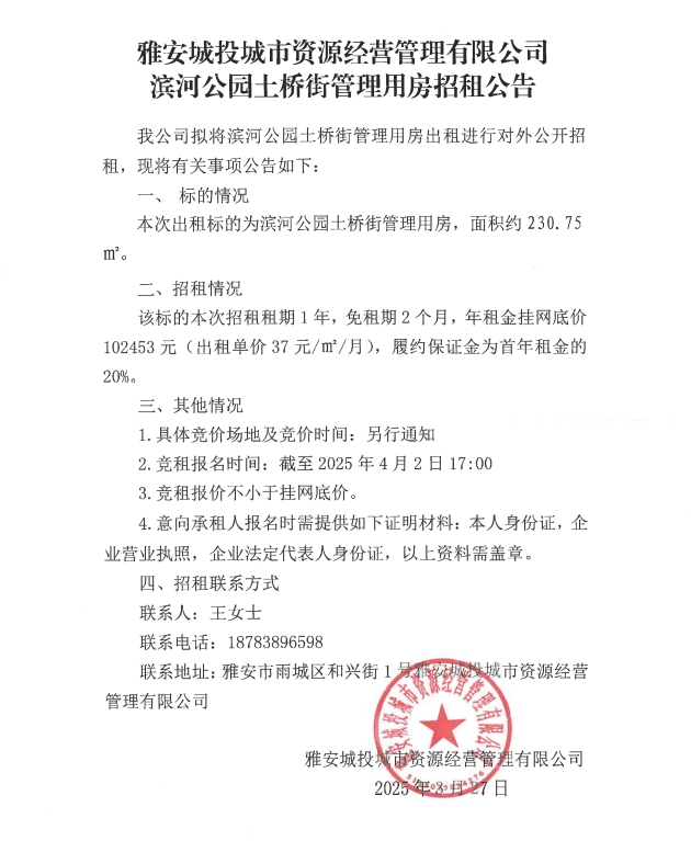 雅安城投城市資源經(jīng)營管理有限公司濱河公園土橋街管理用房招租公告