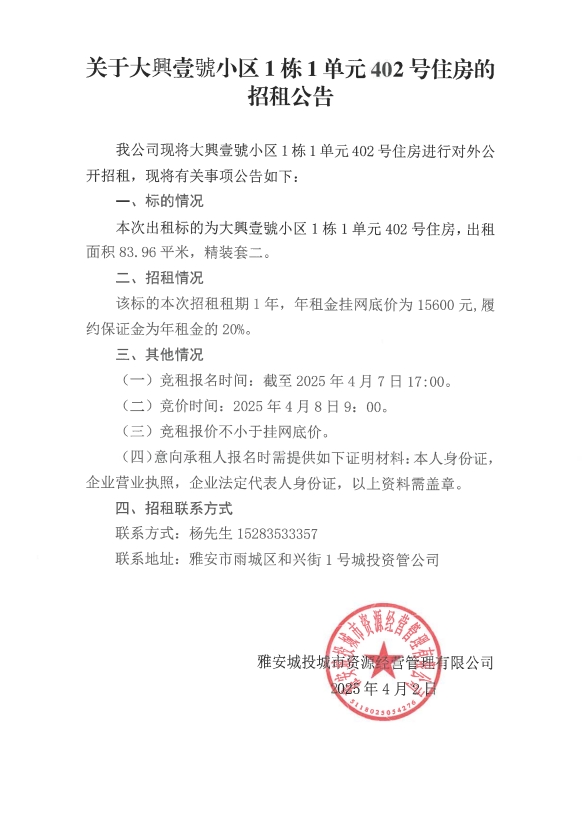 關(guān)于大興壹號(hào)小區(qū)1棟1單元402號(hào)住房的招租公告