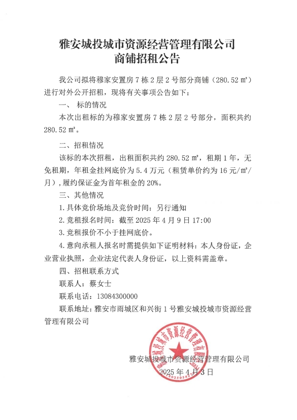 雅安城投城市資源經(jīng)營管理有限公司商鋪招租公告