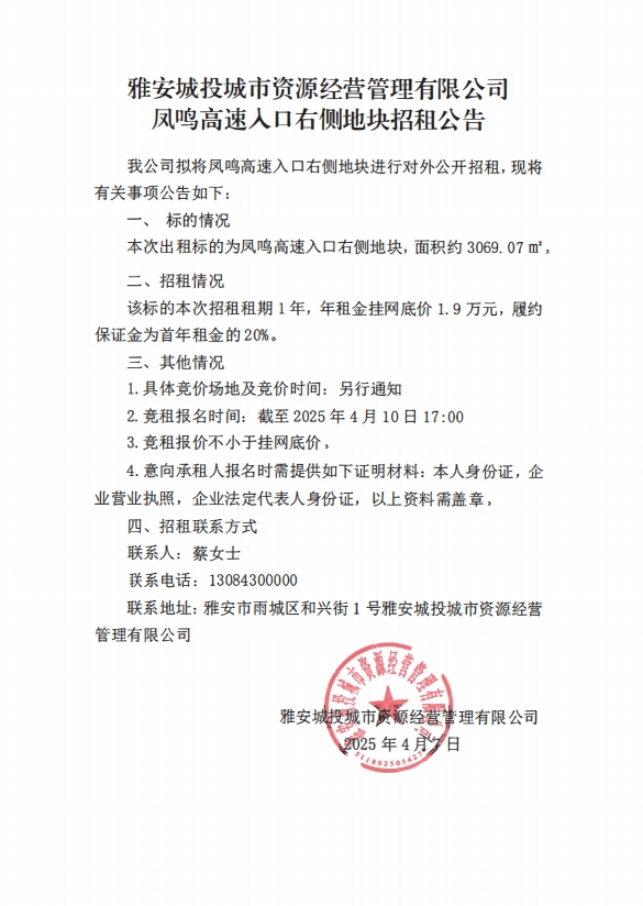 雅安城投城市資源經(jīng)營管理有限公司鳳鳴高速入口右側(cè)地塊招租公告