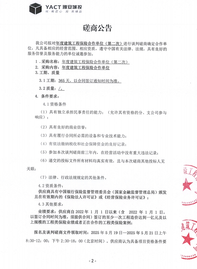 年度建筑工程保險(xiǎn)合作單位(第二次)磋商公告