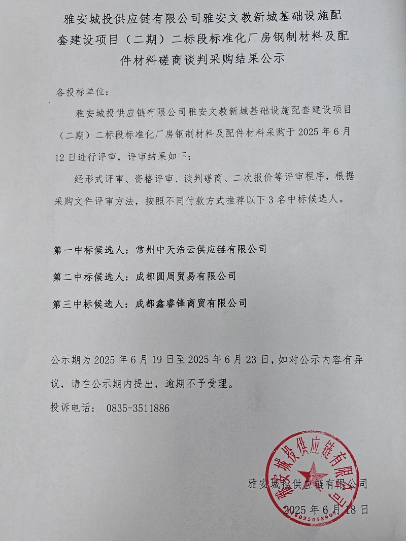 雅安城投供應鏈有限公司雅安文教新城基礎設施配套建設項目(二期)二標段標準化廠房鋼制材料及配件材料磋商談判采購結(jié)果公示