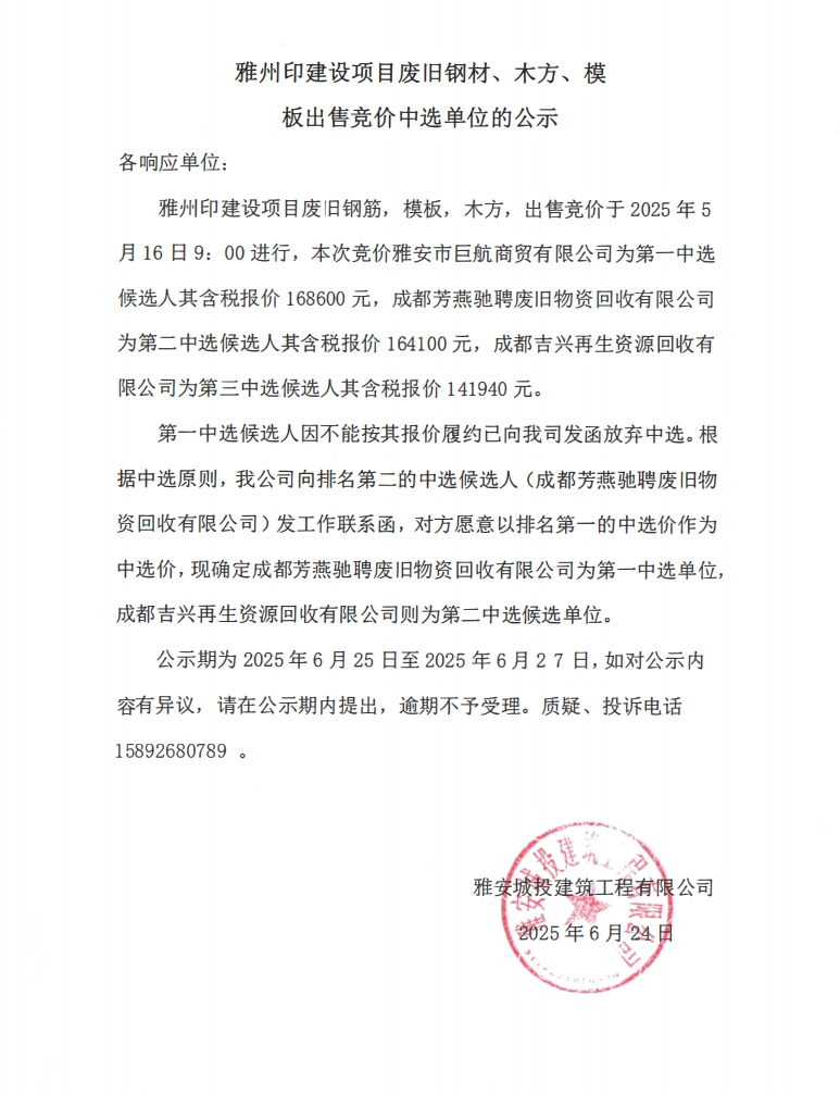 雅州印建設(shè)項(xiàng)目廢舊鋼材、木方、模板出售競(jìng)價(jià)中選單位的公示