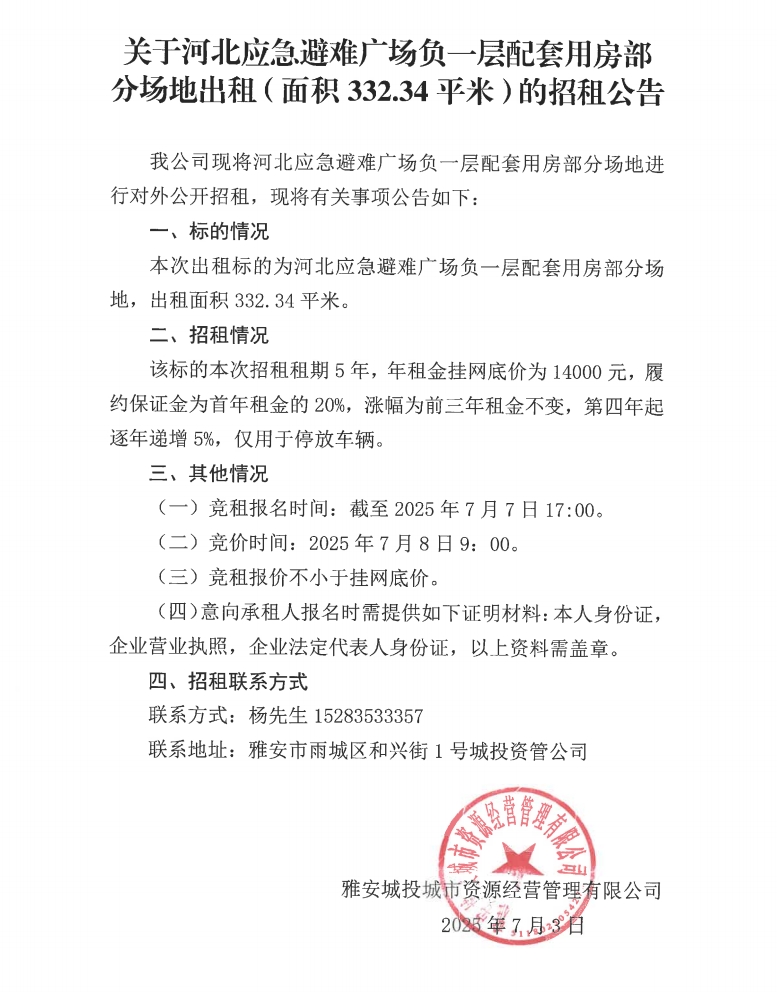 關(guān)于河北應(yīng)急避難廣場負(fù)一層配套用房部分場地出租(面積332.34平米)的招租公告