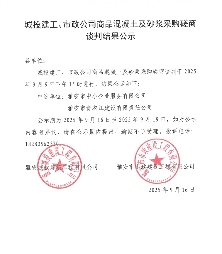 城投建工、市政公司商品混凝土及砂漿采購(gòu)磋商談判結(jié)果公示