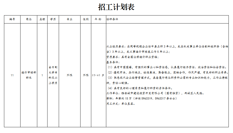 雅安城市建設(shè)投資開發(fā)有限公司造價(jià)審核部部長1名。