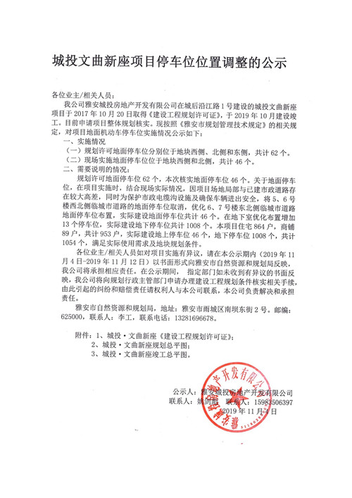 城投文曲新座項(xiàng)目停車(chē)位位置調(diào)整的公示