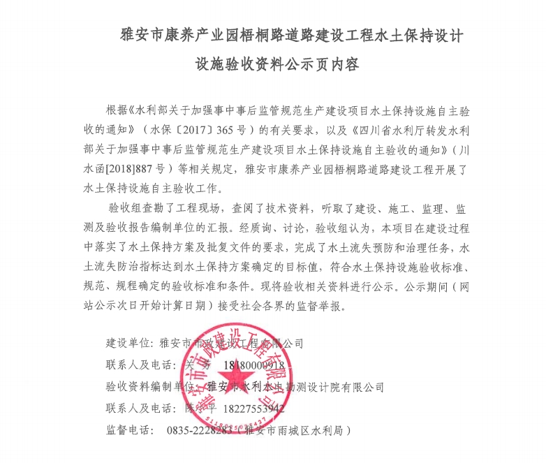 雅安市康養(yǎng)產(chǎn)業(yè)園梧桐路道路建設(shè)工程水土保持設(shè)計(jì)設(shè)施驗(yàn)收資料公示頁內(nèi)容