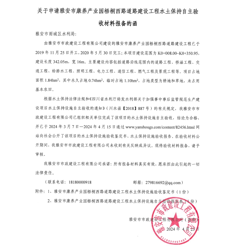關(guān)于申請雅安市康養(yǎng)產(chǎn)業(yè)園梧桐西路道路建設(shè)工程水土保持自主驗收材料報備的函